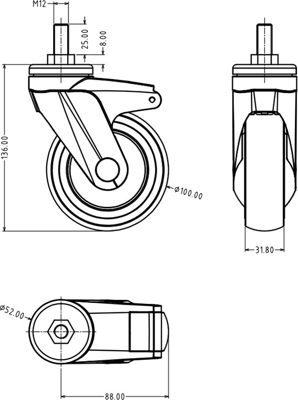 57系列腳輪主架和輪芯采用高強度聚酰胺制材質, 美觀,防腐,防生銹,轉動部分均采用精密滾珠軸承結構、轉動靈活靜音,承載性能好,保證了腳輪的使用壽命,輪胎面采用超靜音TPE材質注塑成型, 耐磨、耐沖擊、承載大整體靜音耐磨、轉動輕巧靈活,彈性好